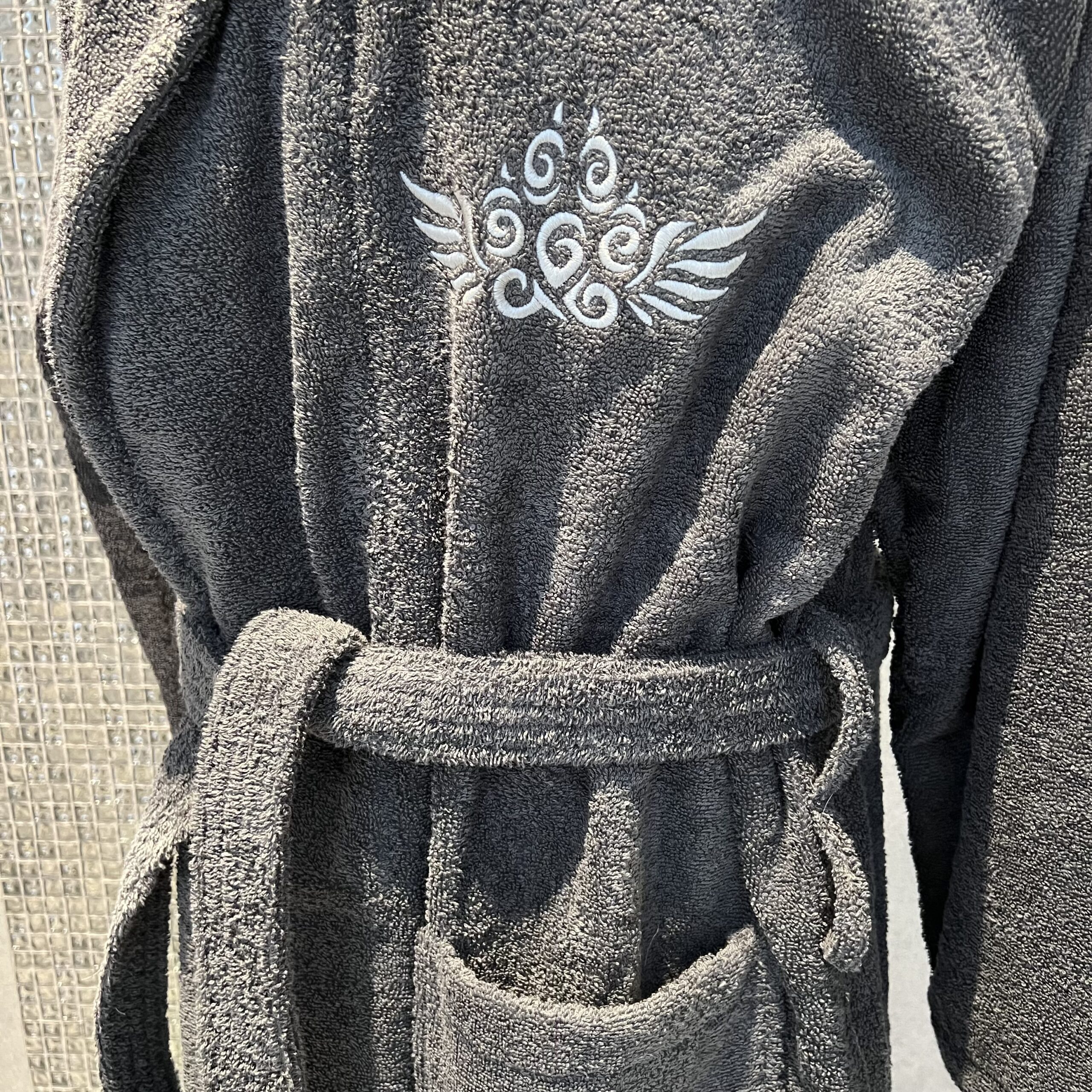 Gönnen Sie sich die verwöhn-Qualität und lassen Sie sich von der gestickten silbernen Engelspfote verzaubern. Perfekt für entspannte Wellnessstunden oder nach einem ausgiebigen Spaziergang zu Hause.